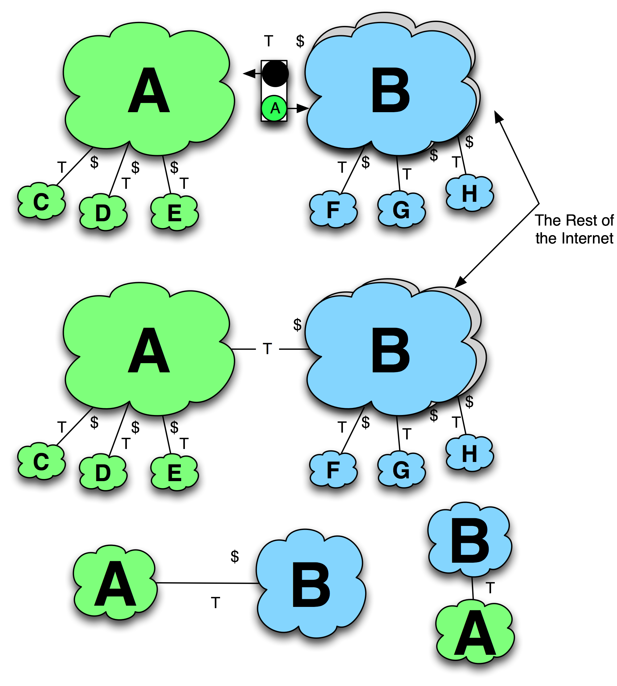 The “T” marking on the interconnection indicates that this relationship is a customer relationship, and the “$” indicates which side is getting paid. If the “$” is absent, it is assumed that the network that is higher in the diagram is the upstream ISP receiving the compensation for the transit relationship.