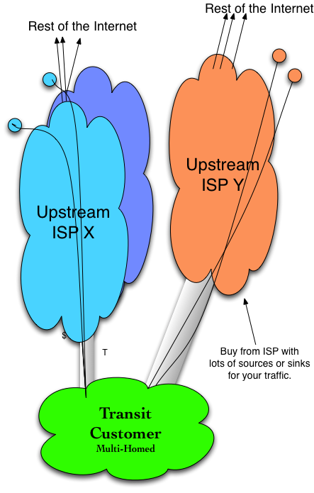One flavor of this multi-homing tactic is to build into a well-populated co-location center a data center housing an open market for Internet Transit services. You will pay for the cost of getting there, but the open-market effect may result in transit pricing 30% or more lower than if the transit provider has to build into your location.