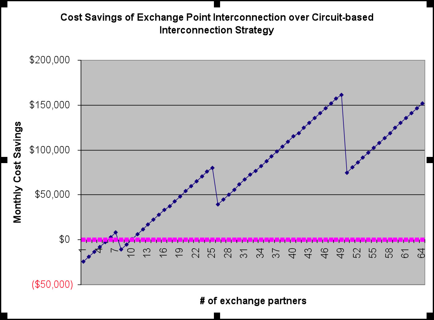 Cost Savings Analysis. Our financial model compares the cost of the direct circuit interconnection model against the cost of the exchange-based model. There is a potential for substantial savings for ISP interconnection under the exchange-based model. There are three drivers to the savings equation. First is the low-cost of the fiber cross connects for interconnection within the Neutral Internet Business Exchange . The second and offsetting cost is the additional expense of pulling a big circuit into the Neutral Internet Business Exchange. The third is the economies of the aggregation of small partially used pipes into a large pipe.